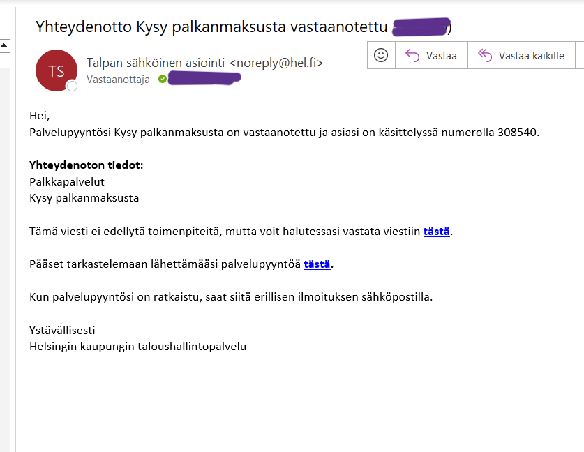Sähköpostiisi pitäisi ilmaantua yllä olevan näköinen sähköposti ja voit käydä katsomassa asiasi edistymistä linkkien kautta.